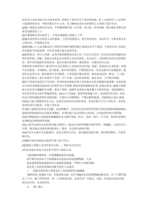 (1)作业人员必须经过安全技术培训,掌握本工种安全生产知识和技能。新工人或转岗工人必须经入场或转岗培训,考核合格后方可上岗,实习期间必须在有经验的工人带领下进行作业。(2)施工现场行走要注意安全,不得攀登脚手架、井字架、龙门架、外用电梯。禁止乘坐非乘人的垂直运输设备上下。(3)不满18周岁的未成年工,不得从事建筑工程施工工作。(4)服从领导和安全检查人员的指挥,工作时思想集中,坚守作业岗位,未经许可,不得从事非本工种作业,严禁酒后作业。(5)建筑施工工人必须熟知本工种的安全操作规程和施工现场安全生产制度,不违章作业,对违章作业的指令有权拒绝,并有责任制止他人违章作业。(6)班组队长,每日上班前,必须召集所辖班组全体人员,针对当天任务,结合安全技术措施内容和作业环境、设施、设备安全状况及本班组人员技术素质、安全知识、自我保护意识以及思想状态,有针对性地进行班前活动,提出具体注意事项,跟踪落实,并做好活动记录。(7)班组队长和班组专(兼)职安全员必须每日上班前对作业环境、设施、设备进行认真检查,发现不安全隐患,立即解决;重大隐患,报告领导解决,严禁冒险作业。作业过程中应巡视检查,随时纠正违章行为,解决新的不安全隐患;下班前进行确认检查,机电是否拉闸、断电、门上锁,用火是否熄灭,施工垃圾自产自清,日产日清,活完料净地清,确认无误,方可离开现场。(8)生产班组在接受生产任务时,应同时组织班组全体人员听取安全技术措施交底讲解,凡没有进行安全技术措施交底或未向全体作业人员讲解,班组有权拒绝接受任务,并提出意见。(9)进入现场的人员必须正确戴好安全帽,系好下须带;按照作业要求正确穿戴个人防护用品,着装要整齐;在没有可靠安全防护设施的高处2m以上(含2m)悬崖和陡坡施工时,必须系好安全带;高处作业不得穿硬底和带钉易滑的鞋,不得向下投掷物料,严禁赤脚穿拖鞋、高跟鞋进入施工现场.(10)进入施工现场的作业人员,必须首先参加安全教育培训,考试合格后方可上岗作业,未经培训或考试不合格者,不得上岗作业。(11)施工现场的各种安全设施、设备和警告、安全标志等未经领导同意不得任意拆除和随意挪动。需临时拆除或变动安全防护设施时,必须经施工技术管理人员同意,并采取相应的可靠措施。(12)不得随意进入危险场所或触摸非本人操作设备、机具、电闸、阀门、开关等。夜间作业场所必须配备足够的照明设施。(13)上班作业前应认真查看在施工程洞口、临边安全防护和脚手架护身栏、挡脚板、立是否齐全、牢固;脚手板是否按要求间距放正、绑牢,有无探头板和空隙。(14)作业中出现不安全险情时,必须立即停止作业,组织撤离危险区域,报告领导解决,不准冒险作业。(15)脚手架未经验收合格前严禁上架子作业。(16)建筑工程施工必须坚持安全第一,预防为主的方针。(17)在高处作业的人员注意不伤害下面的人员:1)清理楼内物料时,应设溜槽或使用垃圾桶。2)严禁从高处向下方投掷或者从低处向高处投掷物料、工具。3)安装或更换玻璃要有防止玻璃坠落措施,严禁往下扔碎玻璃。4)手持工具和零星物料应随手放在工具袋内。1 图纸及材料的主要要求本工程砖墙厚度为240墙。墙体材料:普通粘土砖,外观质量合格,标号为Mu7.5;水泥是PO42.5级水泥,出厂日期不超过三个月。施工所用水泥、砂、石灰材质合格,水泥有出厂合格证,水泥、砂进场后复试合格。砂宜为中砂,水为饮用水。2 施工要点2.1 作业条件2.1.1 弹好墙身线,轴线及窗洞口的位置线,并经检验符合设计图纸及变更要求。隔墙(60mm及120mm厚墙)应随主墙一并放样,并在砌筑主墙时一起搭底,重新砌筑时按摆底的位置进行砌筑;2.1.2 按标高立好皮数杆,皮数杆宜立大墙的转角处,楼梯间及相距10-15米左右的内外墙交接处;2.1.3常温施工时,粘土砖必须在砌筑前1-2天浇水湿润,不得干砖上墙,浇水浸润深度以1-1.5Cm为宜。2.2 施工要点2.2.1 砌筑砂浆:砌体工程施工前必须按砂浆含水率对砂浆配合比进行重新调整,调整后的施工配合比下料单下发至施工班组。施工时应严格按施工配合比进行施工,材料计量应准确。砂浆搅拌前先向己转动的搅拌机内加入适量的水,再依次投入砂子、水泥、石灰膏,加水搅拌,时间不得少于2min0砂浆应随拌随用,一般水泥砂浆和水泥混合砂浆须在拌成后34h内使用完,不允许使用过夜砂浆。已经凝固的砂浆应过筛后用做砂,重新加入水泥、混合料等进行搅拌。2.2.2 组砌方法本工程砖墙采用实心砌体,上下错缝,内外搭砌。砌筑为一顺一丁。2.2.3排病摆底排砖时,为了使窗间墙、垛排成好活,把破活排在中间或不明显的位置,在砌过梁上第一行砖时,不得随意变活。舌头灰刮尽,保持墙面整洁;正确排砖,半头砖分开使用,避免造成通缝不平直、不均匀。两山墙排丁砖,前后纵墙排条砖。根据弹好的门窗洞口位置线,认真核对窗间墙垛的尺寸是否符合排砖模数,如不符合可作适当调整。若有破活,七分头或丁砖应排在窗口中间,附墙垛或其他不明显的部位。另外,在排砖还要考虑在门窗口上边的砖墙合拢时也不出现破活。所以排砖时必须做全盘考虑,前后檐墙排第一皮砖时,要考虑甩窗口后砌条砖,窗角上必须是七分头才是好活。承重砖墙的上皮应为楔砖,如恰好赶上是条砖活时,可用重丁。2.2.4盘角砌砖前应先盘角,每次盘