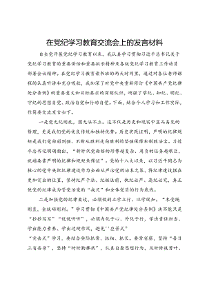 在党纪学习教育交流会上的发言材料自全党开展党纪学习教育以来,我认真学习贯彻习近平总书记关于党纪学习教育的重要讲话和重要批示精神及各级党纪学习教育工作动员部署会议精神。在党纪学习教育读书班的两天时间里,通过对各位老师课程的认真听讲和充分吸收,我加深了对党中央重新修订中国共产党纪律处分条例的重要意义和目标要求的深刻认识,峭强了学纪、知纪、明纪、守纪的思想自觉、政治自觉和行动自觉。下面,结合个人学习和工作实际,作简要交流发言如下。一是党无纪则乱,国无法不立。这不仅是历史和现实中显而易见的哲理,更是我们党的优良传统和独特优势。历史实践证明,严明的纪律规矩是我们党由弱到强、不断从胜利走向胜利的坚强保障和制胜法宝。习近平总书记明确指出,“新时代党面临的形势越复杂、肩负的任务越艰巨,就越要靠严明的纪律和规矩来保证”。党的十八大以来,以习近平同志为核心的党中央把纪律建设作为全面从严治党的治本之策,将纪律建设摆在更加突出的位置,坚持纪严于法、纪挺法前,执纪必严、违纪必究,真正使党的纪律成为管党治党的“戒尺”和全体党员的行为底线。二是加强党的纪律要设,必须做到立学立行、以学促知。“木受绳则直,金就砺则利。”学习贯彻中国共产党纪律处分条例决不能只是“抄抄写写”“说说听听”,必须内化于心、外化于行,学出责任担当、学出能力素养、学出过硬作风,避免''应景式”“突击式”学习,要结合实际抓常、抓细、抓长。要常省察,坚持“吾日三省吾身”,坚持“时时勤拂拭”,认真自查思想行为,及时修枝剪叶、涤荡心灵,把守纪律讲规矩作为行为准则,融入到日常生活的点点滴滴,使其成为一种思想和行动自觉。纪检监察干部更要以身作则,在“守”字上作表率,引导形成全域遵规守纪的良好局面。三是加强党的纪律要设,必须做到心中有党、忠诚坚定。政治纪律是最重要、最根本、最关键的。纪检监察机关作为政治机关,是推进全面从严治党的重要力量,必须把坚决维护以习近平同志为核心的党中央权威和集中统一领导作为根本出发点和落脚点,切实增强纪律建设的政治性,用习近平新时代中国特色社会主义思想武装头脑,引导广大党员干部树牢“四个意识”、坚定“四个自信”、做到“两个维护”,始终同党中央保持高度一致,在思想上认同核心、政治上维护核心、行动上紧跟核心,忠诚履职、主动担当,以实际行动体现对党的绝对忠诚。四是加强党的纪律建设,必须做到人民至上、为民务实。人民群众是党最深厚的执政之基。坚持人民至上,是纪检监察工作的根本立场和价值取向。践行党的群众纪律,要围绕教育医疗、养老社保、就业创业、生态环保、防灾救灾、安全生产、征地拆迁、食品药品、执法司法、行政审批等行业领域人民群众最关心、最现实、最直接的利益,紧盯人民群众的痛点难点焦点,切实解决发生在群众身边看得见、摸得着的“微腐败”问题,着力纠治群众身边的不正之风,让人民群众切身感受到正风肃纪反腐就在身边,不断增强群众的获得感、幸福感、安全感,以风清气正的政治生态凝聚党心民心。五是加强党的纪律建设,必须做到心中有戒、干净廉洁。纪律的生命力在于执行。纪检监察干部是党的纪律的执行者和捍卫者,掌握着监督执纪的权力,必须以刀刃向内的勇气和决心,强化自我监督,从身边人身边事抓起,从具体问题管起,严管“自家人”,严防“灯下黑”,守牢慎独慎初慎微的关口,做到心有所畏、言有所戒、行有所止,不断锤炼严细深实的工作作风,坚决竖起严之又严的自律标杆。纪检监察干部身处反腐斗争一线,时刻都面临着腐蚀与反腐蚀的考验,应当将干净刻入骨髓、融入血液,带头执行廉洁自律准则,始终保持敬畏权力之心,自觉净化生活圈、社交圈和朋友圈,清清白白做人、干干净净做事。全面从严治党永远在路上,纪律的篱笆只会越扎越紧。作为一名纪检监察干部,必须时刻保持清醒的政治自觉,把严管视为厚爱,做到知行合一,习惯在受监督和约束的环境中工作生活,坚决做遵规守纪的倡导者、维护者和践行者。