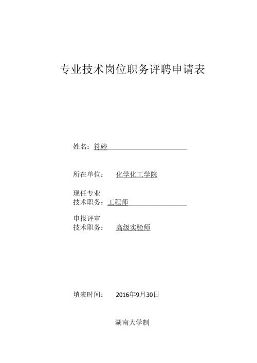 专业技术岗位职务评聘申请表姓名:符婷所在单位:化学化工学院现任专业技术职务:工程师申报评审技术职务:高级实验师填表时间:2016年9月30日湖南大学制填表说明1 .本表除须由部门核实的项外,其他各栏均由本人填写。2 .正反两面打印并装订成册,内容要具体、真实。3 .学制类型指:全日制、函授、同等学历、自考、在职等。4 .评审表中任现职以来的科研项目(按国家级、部省级、其它顺序填写);发表的论文按“CSCD”、“CS发表'、“其他”顺序排列,并注明刊物名称及代号或学术会议名称及地点(申报高级职务者一般刊物论文请勿填写);著作(独著、合著、译著)注明出版社名称及书号。凡未正式发表论文不予计算,任现职前的成果不要填写。5 .本表以16k纸打印,或以16k的版芯用A4纸打印。1 .基本情况姓名符婷性另U女C出生年月1982.7参加工作时间2006.7现任专业技术职务及取得时间工程师2009.7现任行政职务及任同级职务时间无心卜N最高学历(位)硕士研究生申报专业技术职务高级实验师主要研究方向生化分析与生物传感现履职岗位院士秘书联系电话13755198248学术团体任职及社会兼职无教育经历序号起止时间毕业学校所学专业学制类型获得学历或学位11999.9-2003.6湖南大学化学全日制本科、学士22003.9-2006.6湖南大学分析化学全日制研究生、硕士34工作经历序号起止时间工作单位专技(行政)职务从事专业(岗位)12006.7-2010.6原生物医学工程中心生物医学成像课题组助理工程师科研助理22010.7至今化学化工学院分子科学与分子医学实验室工程师实验员345外语水平考试日期考试种类考试成绩2013.12.7全国职称外语考试PETS-5其他52近五年考核结果2011年2012年2013年2014年2015年合格优秀合格合格合格2 .任现职以来主要工作业绩情况年度工作岗位工作业绩本人贡献成效核实人2006年7月至2010年6月科研助理1、担任原生物医学工程中心生物医学成像课题组科研助理,负责科研团队常用仪器设备的管理、维护及培训,常用试剂的配置。2、协助首席科学家指导研究生开展科研工作。负责实验室的管理、参与研究生的培养协助引进新的研究方向一一生物医学成像,圆满完成“985”化学创新平台之生物医学成像研究方向的任务,协助首席科学家培养毕业博士生3人。2010年7月至今实验员1、参与分子科学与分子医学实验室建设工作,负责仪器设备的购置申请、调试,仪器设备技术档案的建立和管理。2、负责实验室的日常管理,包括基本实验试剂的准备、精密仪器的操作、新进人员的实验操作培训等。3、负责常规仪器设备维护、维修和管理;大型仪器设备的维护、使用、管理、其他操作人员的培训。4、兼职生物学院财务秘书,负责生物学院财务。5、积极提高自身实验技能,熟练地掌握实验室基本的操作技术,如核酸适配体的筛选,已初步建成核酸适配体的筛选平台。负责实验室的管理、参与研究生的培养1、以第一作者发表SC1.收录论文3篇。2、承担省级科研项目1项,参与国家级科研项目2项(排名前3)3、分子科学与分子实验室按照国际先进实验室标准建设,成为化学化工学院窗口单位。4、实验室运转正常,协助科学家圆满完成国家重大科学研究计划(973)1项,科技部重大仪器专项1项,国家自然科学基金创新群体1项。实验室目前承担包括国家自然科学基金杰出青年基金、优秀基金、仪器专项等多个国家级项目。5、协助专家成功申请湖南省核酸适配体工程实验室,建成筛选平台,通过省发改委考核,成绩优秀。6、获2015年学校优秀财务秘书先进个人。3 .任现职以来科研工作情况3.1 发表论文(论文类别指:Se1.源刊、SSC1.源刊、校定重点、CSCD、CSSCI、国外期刊、国际国内会议特邀报告、一般论文;收录情况指:SCI、SCIE、EI、SSCKA&HCKISTP,新华文摘全文、新华文摘摘要、新华文摘目录、中国社会科学文摘全文、中国社会科学文摘摘要、高校文科学术文摘全文、高校文科学术文摘摘要、人大复印资料全文、人大复印资料摘要)序号论文类别论文题目发表刊物名称年、卷、期本人排名收录情况及收录号核实人与本职岗位是否相关1SCI源刊AsuperquenchedDNAzyme-pery1.enecomp1.ex:aconvenient,universa1.and1.ow-backgroundstrategyforf1.uorescencecata1.yticbiosensorsChemica1.Communications2013,49,6644-6646第一SCI收录WOS:0003210129000222SCI源刊A1.abe1.-freeDNAzymef1.uorescencebiosensorforamp1.ifieddetectionofPb2+-basedonc1.eavage-inducedG-quadrup1.exformationTa1.anta2016,147,302-306第一SCI收录WOS:0003660782000433SC1.源刊Anefficientf1.uorescenceturn-onprobeforzirconiumviaatarget-triggeredDNAmo1.ecu1.arbeaconstrategyAna1.ytica1.Chemistry2012,84,2124-2128并列第一SCI收录WOS:0003010214000063.2出版学术著作、教材序号著作、教材名称出版社名称、标准书号出版时间本人排名本人承担总字数(千字)全书总字数(千字)核实人与本职岗位是否相关123.3获得专利(专利类型指:发明专利、实用新型专利、外观设计专利、计算机软件著作权登记、集成电路布图专有权登记、PCT.国外专利、其他)序号专利名称专利类型专利号本人排名授权时间批准单位核实人与本职岗位是否相关123.4研究项目(项目级别指:国家级、部省级、其他纵向项目、横向项目、其他;项目类型:教育教改、工程技术、产品开发、产品设计等)序号时间项目名称项目来源项目级别项目类型到账金额(万)本人排名核实人与本职岗位是否相关12013-2014核酸适配体在乳腺癌的早