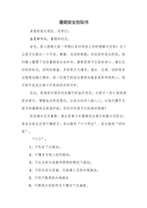 本文(暑期安全告知书.docx)为本站会员(p**)主动上传,第壹文秘仅提供信息存储空间,仅对用户上传内容的表现方式做保护处理,对上载内容本身不做任何修改或编辑。 若此文所含内容侵犯了您的版权或隐私,请立即通知第壹文秘(点击联系客服),我们立即给予删除!
