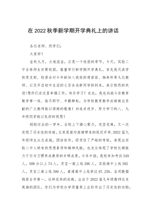 在2022秋季新学期开学典礼上的讲话各位老师、同学们:大家好!金秋九月,大地流金,正是一个收获的季节。今天,实验二中全体师生欢聚校园,隆重举行新学期开学典礼。首先我代表学校党支部、校委会对今年新加入我校的周苗苗、杨林科等九位教师、以及开启初中生活的七百余名新同学的到来,表示热烈的欢迎!愿你们在这里幸福工作,快乐学习!在此,我也向战斗在教育教学第一线、恪尽职守、辛勤耕耘,为学校教育教学成绩做出贡献的广大教师致以崇高的敬意!向追求进步、努力学习的八、九年级同学致以良好的祝愿!刚刚过去的一学年,全校上下凝心聚力,攻坚克难,又一次实现了历史性的突破。尤其是面对疫情带来的延迟开学,2022届九年级师生众志成城,团结协作,经受住了严峻的考验,表现出实验二中人特有的思想素质和精神风貌,也充分体现了学校长期致力于行为习惯养成教育的丰硕成果。今年中招,我校参加考试549人,500分以上74人,灵宝一高上线206人,实验高中上线302人,灵宝三高上线390人,普通高中上线率达87.25%。各项数据稳居全市第一,这样优异的成绩,出自于2022届九年级教师这支英雄的团队,你们为学校办学质量再上台阶作出了历史性的功勋,让我们再次把热烈的掌声送给求实奋进、不断超越的九年级老师们!“雄关漫道真如铁,而今迈步从头越”,在欢庆成绩的同时,我们也要清醒地认识到竞争的压力。为此,本学年学校的各项工作将紧紧围绕“在求实中奋进,在和谐中发展”的思路开展,唱响打造名校的主旋律。深化完善课堂教学,进一步提高课堂效率,在抓好常规的同时,实施精细化管理,使过程性管理成为取得成绩的保障。新的一学期,我们要在“当名师”上下功夫。学校为青年教师脱颖而出搭建平台,造就更多在省峡市有影响力的名师,打造一支德艺双馨的高素质教师队伍。在这里,我提几点建议:一要做一个学习者。首先是一个善于学习、喜欢读书的人,耐得住寂寞,能坐得住冷板凳,能沉下心去搞教学研究,有较高的学科素养。二要做一名奉献者。热爱岗位,热爱学校,甘于吃苦,乐于奉献。实验二中这所大厦不是靠一个两个人来支撑,需要所有人共同来竭尽心智,努力奉献。三要做一名合作者。树立虚怀若谷、海纳百川的思想,团结互助,加强交流,实现共同成长。同学们,新学期,站在新的起点,如何才能使自己成为高素质的优秀学生?我给大家提三点要求:一要志存高远,把握人生。一流的学生一定要有远大的志向,才能考入一流的大学。二要勤学善思,务实求新。优秀的学生都有一个共性,就是具有自学钻研的精神。勤学善思是求学的基本途径,“务实”就是要脚踏实地,“求新”就是要观念先进、学法灵活。三要意志坚强,不畏挫折。一定要有良好的心理素质,学习生活中,会收获成功的喜悦,也会遇到挫折和失败。享受成功我们能做到,勇敢面对挫折、从失败中寻找新的支撑点重新爬起来,我们也一定能做到。七年级的同学们,你们即将开始人生新的篇章,我对你们充满希望!古人说:“合抱之木,始于毫末。“希望你们尽快适应初中生活自立、自主、自觉的要求,从军训到上课,严格要求自己,牢记学校精神:“认真做好每一件事”。八年级的同学们,你们经过一年的成长,变得沉稳、大气、有担当,此时此刻,你们还来得及把握自己命运之舟的方向和速度,无论是暂时领先还是稍微落后的同学,都要加强反思,反思自己一年来的行为品德、学习方式,总结成功与不足,重新定位,再接再厉!九年级的同学们,你们是准备接受明年六月中招洗礼的雄鹰,是将要在考场上实现远大抱负的战士!从今天开始,冲刺中招的号角已经吹响,未来的每一天都值得我们争分夺秒,与时间赛跑,与对手竞争。你们的身上,汇集了老师们最多的目光,倾注了家长更多的心血,希望你们拿出“舍我其谁”的气魄,千锤百炼,挑战极限,成就梦想。老师们,同学们,实验二中为大家提供了一个施展才华、获得成功的广阔舞台,我们一定可以在这里放飞梦想,实现人生价值。育人的事业精益求精,我们的未来前程似锦。风正潮平,自当扬帆破浪;任重道远,更须快马加鞭。我们将带着全校两千余名师生的理想,向着更加辉煌的未来,乘风破浪,奋勇向前!高中校长在2022-2023学年度秋季学期开学典礼上的致辞尊敬的领导,亲爱的同学们,老师们,大家上午好!首先,请允许我代表学校,向今年新入职的XXX名老师和XXX名高一新同学,XXX7名初一新同学表示热烈的欢迎和衷心的祝福。希望你们在XX校园开启自己的新生活、新起点、新征程!今年贵州教育大讲堂开学第一课请党放心,强国有我在我们学校录制,这是XX中学的骄傲与自豪,是上级教育主管部门对XX中学的认同和肯定,是全体教职工的不懈努力,是全体XX同学全面发展,综合实力的成果体现。在此,我衷心地感谢全体教师和同学。今天,在开学典礼这个特殊的日子,我想和同学们讲一讲XX中学的办学特色:“五育并举,造就完全人格”。XX中学创建于1938年,创始人周诒春提出“我XX学校历来之宗旨,凡可以造就一完全人格之教育,未尝不悉心尽力”。从此,“完全人格”教育就成为历代XX人追求的教育目标。“完全人格”就是以全面发展的人为核心,具有“三面九维”“三有三能”的完全人格教育体系。第一面:文化基础包括:有积极乐学,审美鉴赏,能创新创造。积极乐学的含义是,同学