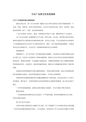 污水厂运营卫生防疫措施1.1.1卫生防疫环保方面的监控避免出现公害,是厂区污水处理厂赢得公众认可和支持的各方面中的最重要的一个方面。因此,将研究一套设计和管理协议,以及空气和水体污染、噪声、废弃物、恶臭、啮齿类动物、蚊子、鸟类、害虫等控制标准。厂区污水处理厂的设计、建设、管理和运行等各个方面,都将采用以下方式进行:本厂区污水处理厂将遵照执行空气污染、噪声污染、水污染、废弃物污染等各类污染和环境保护等方面的现有控制政策和法规。未经业主同意,不会安装使用在各种条件下生成烟雾或者其它任何空气污染的各种炉具、锅炉、其它设备和装备或燃料。如果没有经过业主特别许可,不允许在厂内焚烧碎屑或者其它任何物质。1)蚊蝇控制特殊情况下,由于季节或厂区环境造成较多苍蝇时,在征得业主同意时喷洒杀虫剂。由专职人员,在技术人员的指导下喷洒灭蝇药物。喷洒人员还应穿用合适的防护服装和防毒面具。喷洒杀虫剂时,应该避免污染地表水。灭蝇药的选取除了防止苍蝇的药物抗性而轮流采用外,还要符合一般农药的施用要求,避免对人员健康的损害和在土壤中的残留。如果雨水管理设施的任何部分破碎屑堵住,导致出现积水现象,就会立即清除这碎屑并恢复确动式排水,雨水管理系统的正常维护,可以防止碎屑堆积。将保持所有的废物容器和其它贮藏容器随时处于清洁状态,并且盖住其开口,以防止存有静水、孽生蚊子。末使用的能存水的设备和移动式器材均要覆盖,防止积水及蚊于孽生。厂内所有的构筑物前,部将在显著位置设立招贴栏,并且写明蚊子孽生的危害。2)鼠害控制一旦发现啮齿类动物和害虫己经成为一个严重的问题,将采用短期控制方法,即使用杀虫剂和灭鼠药。3)职工的卫生防疫该项目的重点始终放在正确的卫生方面。为了尽量减少与卫生和流行病有关的问题,厂内所有的设施均将保持在清洁、卫生的状态。处理站的工作人员必须应穿戴卫生和预防流行病的装备,组织职工进行每年一次的身体检查。1.1.2员工的健康和安全做好个人劳保工作。以下为个人劳保的具体措施:1)如果员工被发现在场区内工作时没有使用规定的个人劳保用品,会接到警告信,且警告信的副本会保存在该员工的个人档案中。进一步的纪律措施可能会导致解除合同。2)个人劳保用品要求安全帽:室外或在维修车间工作必须戴安全帽(除非是在车辆或重型机械内)。眼睛防护用品:当工作需要时,员工必须佩戴符合工作需要的护眼用品(如:护目镜、眼镜、面罩)。脚防护用品:员工进行室外作业、重物搬运工作时必须穿安全鞋。橡胶靴会提供给需要在室外湿滑泥泞环境下工作的员工。防尘口罩:员工在多尘环境下工作时,必须佩戴防尘口罩。呼吸器:在有可能接触到有害灰尘或烟雾的员工,必须佩戴呼吸器。听力保护器:在高噪音环境内必须佩戴防护耳塞。在特别情况下,工作人员须佩戴防护耳罩,作为长时间在高噪音下工作时使用。安全带:员工在高处作业(2m以上),如果设置直立的护栏杆是不可行的话,应配好合适的安全带或绳索,并连接在合适牢靠的固定点或救生索系统上。3)所有劳动保护用品必须依照其制作商建议的正确方法穿戴。如没有制作商的用法说明可参照时.,工作人员本身也有责任找出其个别用品的正确使用方法。4)焊接或切割时,工作人员必须穿戴焊接用面罩、眼镜及手套。5)工作人员处理腐蚀性或危险性化学品,必须穿戴抗化学的手套、防护面罩、口罩、橡胶靴及其它合适的劳动保护用品。6)服从所有张贴在特定区域内的安全指示说明,包括其强制性使用某种劳工保护用品的指引。