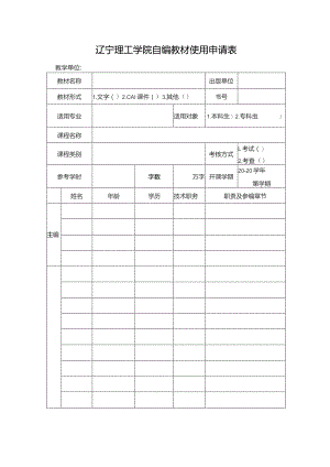 本文(辽宁理工学院自编教材使用申请表.docx)为本站会员(p**)主动上传,第壹文秘仅提供信息存储空间,仅对用户上传内容的表现方式做保护处理,对上载内容本身不做任何修改或编辑。 若此文所含内容侵犯了您的版权或隐私,请立即通知第壹文秘(点击联系客服),我们立即给予删除!
