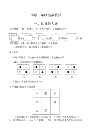 小学二年级奥数教材一、比谁眼力好王牌例题1下面一组图中,有一个是不同的,你能找到它吗?图曷两个完全一那半圆拼成包个整圆,没有蠹叠。这几组图形中,第4组图形与其他的不同。疯狂操练11、下面一组图形,其中有一个是不相同的,你能找出来吗?3、你能把与其他不同的找出来吗?王牌例题2根据规律接着画。O©目因O【思路导航】仔细观察图可以发现,第一竖行是三个根本图形O、,第二竖行是在。、口外面加了一个圆,第三竖行由上两个图形发现是在。、外加上了一个方框,由此可推断第三个空格的图应该在口外加上一个方框。所以图中空格里应该画回。疯狂操练21、按顺序仔细观察图,第三幅图“?处该怎么填?。上?2、按顺序仔细观察,在“?处填图。?3、接着国。OOOM()()口百百王牌例题3在方框里填上适当的字母。EE0E000E【思路导航】仔细观察这些字母,不难发现,每一横行、竖行都有字母A、B、C,只不过是排列顺序不同而已。因此空格里横看、竖看,都应该填B。疯狂操练31、按规律在空格里画上图形。2、在空格里填上适当的图形。3、接着圆。王牌例题4请你根据前三个图形的变化规律,画出第四个图形来。【思路导航】通过观察可以发现这三幅图都是把完全一样的圆平均分成4份,把其中的一份涂上阴影。第一幅图阴影局部在左上角,第二幅图阴影局部在左下角,第三幅图阴影局部在右下角,根据这个规律,第四幅图阴影局部应该转到右上角。所以第四个方框里应填Vlo疯狂操练41、请你根据前三个图形的变化规律,画出第四个图形来。OOOOOOOooOOOOOOooooOO2、接下去该怎样画?3、仔细观察图,在第四幅中应画什么图形?第十幅图应画什么图形?逆时针方向依次转动。根据规律第四幅图应该这样画:疯狂操练51、仔细观察,第四幅图应画什么图形?OIItO.O2、想一想,第四幅图该怎么填?二、火眼金睛王牌例题1观察以下图的变化,想一想第4幅图应画上怎样的图形?右为“的位置按“上一左的顺序变化的,因此第四幅中“一的位置应向下为“I。正方形、圆随便怎样转动,图形都一样,因此,“口在第四幅中应在上面,“O应在下面。第4幅图应该这样I田I疯狂操练1JO»1、仔细观察,第四幅图应画什么图形?2、想一想,空白处应填什么图?AB【思路导航】左边的A图中,左上角有两个横着的点,B图中左下角有两个竖着的点,右下角有个横着的点,把这两个图形重叠后,点的个数和方向不会变,还应该是左上角两个横着的点,左下角两个竖着的点,右下角两个横着的点。因此把左边A、B的两个图形重叠后,变成下边的图(2)。疯狂操练2把每题左边两个图形重叠后,变成右边的哪个图形。王牌例题3将A、B两个图形重叠后,变成下边的哪个图形?【思路导航】新图形是由两个图形重叠而成的。思考时可以用A作标准,找B图在它上面的相应位置,由此可以推断出A、B重叠后应该成为图(3)疯狂操练31、将以下图A、B左边两个图形重叠,变成下边的哪个图形?2、A、B两个图形,重叠后,可以组成下面哪个图形王牌例题4下面的图形少了一块,应该补上哪一块图形才完整?(在编号上打“7【思路导航这幅图是一些横向和竖向的线条。缺的这一块根据上下花纹来推理,横向的应该是两条横线条,竖向的应该是一条竖线条。由此可以推断,只有图(4的花纹较适宜。所以应该补上图(4)才完整。疯狂操练4下面图形缺少了一块,应补上哪一块图形才完整?王牌例题5在空格里画出适当的图形。【思路导航观察左边竖向的三幅图,都是在的啊图形里放一个同样形状的涂黑的小图形,即大圆里放小黑圆,大正方形里放小黑正方形。右边的两幅图是先把左图中小圆、小正方形边空放在上面,把大圆、大正方形平均分成两份,取下面的一份并涂黑,放在小圆、小正方形的下面。由此可推断,右边最下一个空格里的图,应该是小半圆变空,大半圆平均分两份,取下半份涂黑放在小半圆的下面。空格里的图应该是疯狂操练51、想想图形的排列规律,再在空格里填上适当图形。2、观察下面图形的变化规律,推断出问号处是什么图形?3、根据规律,推断出问号处是什么图形?三、按规律填数王牌例题1按规律填数。(1) 15,5,12,5,9,5,(),()(2) 5,9,10,8,15,7,(),()【思路导航】(1)第一个数15减去3是第三个数12,第三个数12减去3是第五个数9;第二、四、六个数不变,根据这一规律,第七个数是93二6,第八个数还是5。(2)第一个数5加上5的和是第三个数10,第三个数10加上5的和是第五个数15,第二个数9减去1的差是第四个数8,第四个数减去1是第六个数7,根据这一规律,第七个数应是15+5=20,第八个数应是71二6,即20和6。疯狂操练1按规律填数。1. 25,4,20,4,15,4,(),()2. (),(),7,34,7,36,7,38(),(),5,4,9,6,13,83. 16,3,8,9,4,(),()40,16,20,8,10,4,(),()王牌例题2仔细观察,找规律填数。0,1,2,3,6,7,(),()【思路导航】这里第一个数加上得第二个数(0+1=1),第二个数乘2得第三个数(1X2=2),第三个数加上1得第四个数(2+1=3),第四个数乘2得第五个数(3X2=6),即根据加1,乘;加1,乘2的规律,可以确定括号内应填7X2=14,14+1=15,即14,15这两个数疯狂操练2仔细观察,找规律填数。),(),()( ),( )4, 5, 6,(),()1. 1,2,4,5,10,(2. 3,6,5,10,9,(3. 3,6,12,(),4. 30,15,14,7,6,5. 2,3,4,3,4,5,数是从4开始依次加2,加3,加4得到,这样最后一个数就是13+5=18。下排的数是从5开始依次加4,加6,加8得到,这样下排最后一个数就是23+10=33,所以空格中应填疯狂操练31 .在空格里填上适当的数。181522139272 .在空格里