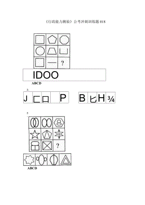 行政能力测验公考冲刺训练题018IDOOJ匚口PABCD2、3、B匕H¾ABCD5、雷整缴覆雷整缴覆ABCDoLO11?Zhtt(三)II根据下表回答610题指标名称累计(千美元)12月(千美元)比去年同期增长累计进出口总额176068645216719080623.8出口9690728399409405527.2一般贸易4163182914152521832.1来料加工装配贸易94482771949877912.5进料加工贸易4158921503874062725.1机电产品5494342965312585428.8高新技术产品2814860292762486629进口7916136137309675020成品油1555155090815549.2钢材198275461807401-19.4汽车及汽车底盘751845784558747机电产品4277275484013343422.1高新技术产品2473091702319427525.16. 2005年12月高新技术产品的进出口额分别是多少亿美元?()A.214185B.185214C.310389D.3893107. 2006年12月机电产品的出口额比进口额多()A.12992420千美元B.12992421千美元C.121706748千美元D.121706749千美元8.根据上表可知,2006年12月的贸易顺差是()A.21997305千美元B.177459228千美元C.20997305千美元D.177459226千美元9,2006年来料加工装配贸易出口额占进出口累计总额的比例比进料加工贸易出口额占进出口累计总额的比例低()A.51.34%B.27.5%C.18.23%D.30.1%10.根据上表,与2005年同期相比,2006年出口贸易额增长最快的是()A.一般贸易B.进料加工贸易C.机电产品D.高新技术产品11、有一种捉猴子的陷阱,即把椰子挖空,然后用绳子绑起来,接在树上或固定在地上,椰子上留了一个小洞,洞里放了一些食物,洞口大小恰好只能让猴子空着手伸进去,而无法握着拳头伸出来,于是猴子闻香而来,将它的手伸进去抓食物,理所当然地,紧握的拳头便缩不出洞口,当猎人来时,猴子惊慌失措,更是逃不掉。这个故事给我们的启示是:A.要懂得衡量利益的得失,不要因小失大B解决问题的途径不止一条,要学会变通C.陷阱常基于人内心的贪念,无欲则刚D.不要被内心对欲望的执着所束缚,要懂得适时的放手12、相比于儒家的以政治伦理为核心的“道”,老庄之“道”因其玄虚的特征,更宜于作出超越性的解释,从而满足人们对于生命的具有宗教意味的渴望:它永远具有无限的可能,化生万物却始终保持自身的虚静,不因世间的变化而发生任何改变。在万物源于道的根本原理之下,个体生命与道本是统一的;当生命摆脱了俗世的成败毁誉的羁绊而与道化合为一时,从精神意义上说,它自然也就获得了道所具有的品性。正是上述区别,造成了魏晋时代儒学的衰落与老庄学说的兴起。这段文字旨在说明:A.儒学与道学在对生命意义的解读上存在本质不同B.道学蕴含的宗教意味迎合了人们的精神需求C.魏晋时代儒学衰落而老庄学说兴起的原因D,只有摆脱俗世的羁绊,人才能体悟“道”的内涵13、在人类的身体中,细菌的数量要远远多于人体的细胞,其中大部分细菌对人是有益的,有助于我们消化食物。但是,肠道内的有益细菌有时会死亡或被清除。阑尾不仅能重启在患病时被删除掉的肠道系统内的有益细菌,而且因其所处的位置正好在正常的食物流以下,作为大肠的死胡同,它贮存了各种各样的细菌。这些都说明阑尾就像一个安全的备份盘。从形状上看,阑尾就像一个蠕虫似的器官。实际上,它是一个细菌加工厂,培养着对人有益的细菌。但是,在疾病流行之时,如霍乱影响到某个地区,阑尾就不可能轻而易举地培养出细菌。下列关于“备份盘”和“加工厂”的解说,不正确的一项是:A.阑尾就像一个“备份盘”,是因为它能重启因疾病被删除掉的肠道系统内的有益细菌B.在疾病流行之时,阑尾不能培养出细菌,所以它并非严格意义上的细菌加工厂C.形状像蠕虫似的阑尾,能培养对人有益的细菌,就像一个细菌加工厂D.阑尾贮存了各种各样的细菌,且处在正常的食物流以下,作为“备份盘”,很安全14、清代是紫砂壶发展的鼎盛时期,制壶名家辈出,在选料、配色、造型、烧制、题材、纹饰、工艺等方面都较完善。紫砂壶的发展与当时的社会经济文化生活息息相关,清代的饮茶习俗非常普及,己成为人民日常生活中的必需品,故紫砂壶的发展日益兴盛。清代的茶有红茶、绿茶、白茶、黄茶、花茶、散茶六大类,同今天的茶大体相同。茶具则承明制,多以陶瓷为主,瓷以景德镇的瓷茶具为优,陶茶具以宜兴的紫砂茶具最为出色。这段文字阐述的主旨意思是:A.紫砂壶与饮用茶之间的配套关系B.紫砂壶与当时社会生活间的联系C.紫砂壶的发展在清代鼎盛的原因D.紫砂壶与清代的饮茶习俗的联系15、在今天这样一个各种价值观念并存的社会环境里,写作者对生活、对艺术的态度和情感显得越来越重要。我们需要有娱乐性的戏剧,但不能都去做这类戏,如果那样的话,艺术就可能沦落为玩具,变成社会生活中的小玩闹。现实主义戏剧要打动人心,创作者必须直面现实生活,忠实地书写,真实地表达。同时,深切的人文情怀对于创作者也至为重要,一个真正的好作品既要有对社会生活的真实书写,也要有强烈的人生体验;既要有冷峻的批判、思考和反省,也要有真挚的情感,而这一切都来自写作者敏感而纤细的心灵。以下对这段文字理解不准确的一项是:A.现实主义戏剧创作应强化人文主义情怀B.娱乐性的戏剧有违艺术的宗旨,可能会让艺术沦落为玩具C.一个好的戏剧创作者定会拥有一颗敏感而纤细的心灵D.真实再现生活和凸显人文情怀是现实主义戏剧成功的法宝16、从政的政治家明明内向就不要强装,明明木讷最好就别故作,成功的政治家不该为自己规划一条违背自己性格的形象道路。填入