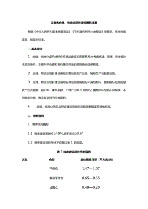 甘肃省仓储、物流业项目建设用地标准根据中华人民共和国土地管理法节约集约利用土地规定等要求,结合我省实际,制定本标准。一.基本规定1 .仓储、物流业项目建设应根据其建设发展需要,综合考虑环境、资源、资金等技术经济条件,本着科学合理和节约集约用地的原则确定建设规模。2 .仓储、物流业项目建设用地主要包括生产设施、辅助生产与配套设施。3 .仓储、物流业项目建设用地标准包括控制指标和用地指标,控制指标包括固定资产投资强度、容积率、建筑系数、土地产出率4项指标;用地指标包括不同规模、不同类型仓储、物流业项目的用地面积。4 .仓储、物流业项目应符合建设用地标准和国家规定的其他标准。二、用地指标1 .粮库用地指标1.1 粮库建筑系数应40%,容积率应0.6°1.2 粮库建设项目用地不应超过表1的规定。表1粮库建设项目用地指标名称仓型单位用地指标(平方米/吨)平房仓1.471.07散装平房仓0.650.35浅圆仓0.400.20粮库立筒仓0.300.15注:1.平房仓:占地综合指标为粮库围墙内用地。建设铁路专用线、港池或堆场(晒场)的粮库,占地指标取高值。仓房跨度大,组合长度长时,占地指标取低值。2 .散装平房仓:仓房跨度大,组合长度长时,占地指标取低值。3 .浅圆仓:本指标适用于直径25米一30米,单仓仓容05万吨一1万吨的浅圆仓群。装粮高度高、单仓仓容大、组群总储量大时,占地指标取低值。4 .立筒仓:本指标适用于装粮高度不小于21米,仓容量1万吨一10万吨的立筒仓群。装粮高度高、组群总储量大时,占地指标取低值。2.棉麻仓库用地指标2.1 棉麻仓库建筑系数应40%,容积率应0.602.2 棉麻仓库建设项目用地不应超过表2的规定。表2棉麻仓库建设项目用地指标类别规模(吨)单位用地指标(平方米/吨)500001000002.051.70棉库储备库30000500002.102.0510000300002.502.101000001500002.912.33500001000003.072.91经菖库10000500003.333.07麻库200050004.163.24注:i.本指标仅为阵区围墙内用地指标,不包括库区外铁路专用线及码头用地。2 .棉麻仓库建设项目规模介于表列两个规模之间的采用内插法计算,规模范围外的采用上下限指标确定。3 .仓储、物流类项目用地指标3.1 仓储、物流类建设项目固定资产投资强度、土地产出率、容积率、建筑系数应符合表3的规定。表3仓储、物流类建设项目控制指标类型固定资产投资强度(万元/公土地产出率顷)(万元/公顷)容积率建筑系数通用仓储类13501200>0.840%保温冷藏类270012750.640%冷冻类270012750.640%化学危险品类165013500.630%城市配送类210022500.640%农副产品类15006750.640%堆场类3757500.340%3.2仓储、物流类建设项目用地不应超过表4的规定。表4仓储.物流类建设项目用地指标类型分级单位用地指标(平方米日流通量(吨/天)/吨)大型>500024300050003524中型100030004535通用仓储类小型10005345大型>500019300050002819中型100030003628保温冷藏类小型10004236大型>500019冷冻类中型300050002819100030003628小型10004236大型>500020300050002820中型100030003528化学危险品类小型10005335大型>500018300050002618中型100030003426城市配送类小型10004134大型>500021300050003121中型100030004031农副产品类小型10004540大型>500019300050002819中型100030003628堆场类小型10004236注:1.化学危险品类仓库应根据物品的种类、性质采取相应的通风、防爆、泄压、防腐、防泄漏、防晒、调温、消除静电、防护围堤等措施,安全防护范围应满足建筑防火通用规范(GB500372022)及物流建筑设计规范(GB511572016)相关要求。2 .仓储、物流类建设项目日流通量介于表列两个规模之间以及小于下限规模的采用内插法计算。4 .调整系数4.1 不同区域的仓储、物流业项目建设用地指标可按照表5中区域调整系数对用地指标进行调整。表5用地指标区域调整系数表区域市县系数陇南市:武都区、文县、宕昌县、康县、成县、徽县、西和县、礼县、两当县。甘南藏族自治州:合作市、临潭县、卓尼县、夏河县、I类地区玛曲县、碌曲县、迭部县、舟曲县。0-98平凉市:Jl空幅区、华亭市、崇信县、泾川县、灵台县、庄浪县、静宁县。庆阳市:西峰区、庆城县、合水县、华池县、环县、11类地区正宁县、镇原县、宁县。1兰州市:城关区、七里河区、西固区、安宁区、红古区、榆中县、永登县、皋兰县。天水市:秦州区、麦积区、甘谷县、武山县、秦安县、清水县、张家川回族自治县。定西市:安定区、通渭县、陇西县、渭源县、临沈县、漳县、岷县。临夏回族自治州:临夏市、临夏县、广河县、康乐县、永靖县、和政县、东乡族自治县、积石山保安族东乡族撒拉族自治县。白银市:会宁县。白银市:白银区、平川区、靖远县、景泰县。武威市:凉州区、民勤县、古浪县、天祝藏族自治县。金昌市:金川区、永昌县。张掖市:甘州区、临泽县、高台县、山丹县、民乐县、肃南裕固族自治县。酒泉市:肃州区、玉门市、敦煌市、金塔县、瓜州县、肃北蒙古族自治县、阿克塞哈萨克族自治县。In类地区嘉峪关市。1.02