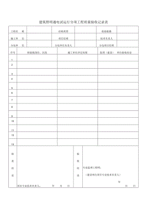建筑照明通电试运行分项工程质量验收记录表工程名称结构类型检验批数施工单位项目经理技术负责人分包单位分包单位负责人分包项目经理序号检验批部位、区段施工单位评定结果监理(建设)单位验收结论12345678910111213检查结论项目专业技术负责人:年月日验收结论专业监理工程师:(建设单位项目专业技术负责人)年月日
